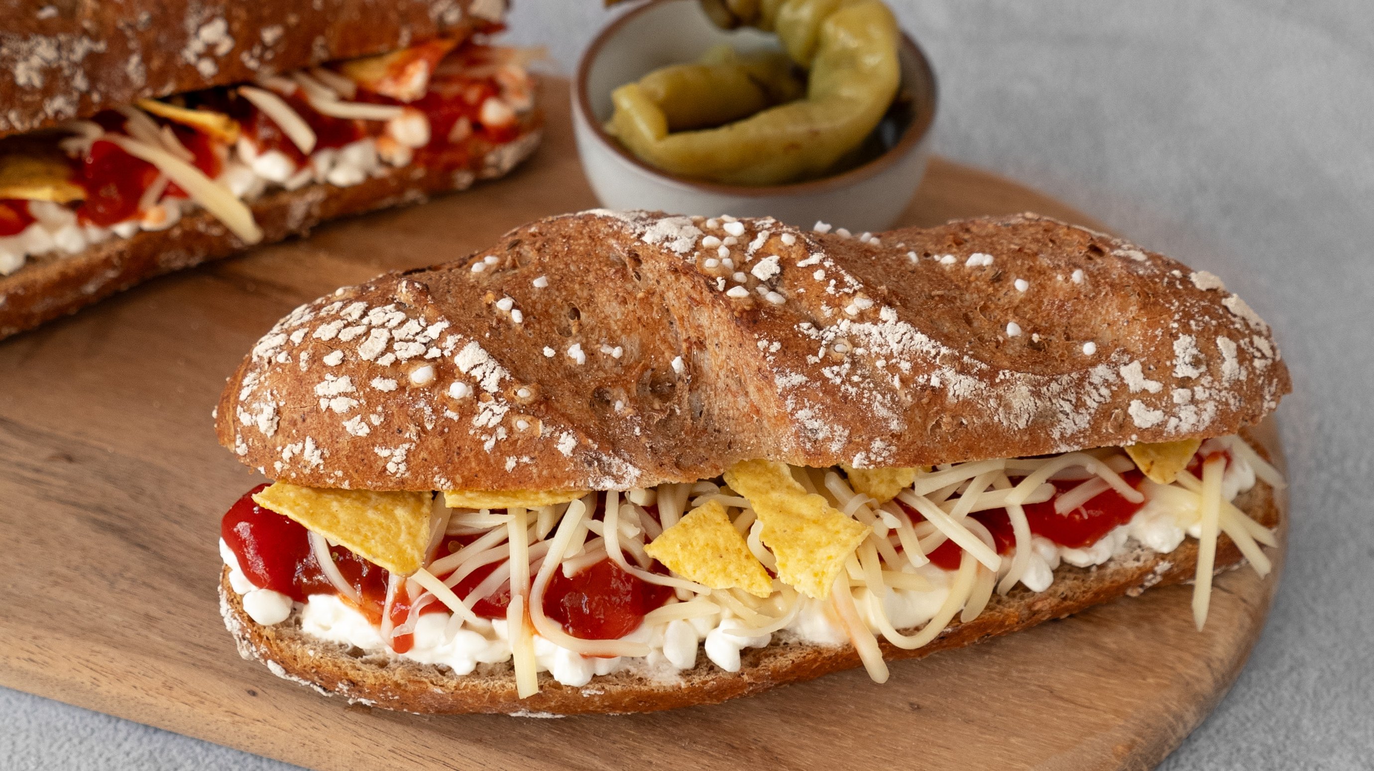 Den körnigen Frischkäse auf die untere Hälfte eines Kornspitzes streichen. Mit der Tomatensalsa, dem geriebenen Käse und etwas getrocknetem Oregano bestreuen. Zum Schluss die Tortilla Chips Stücke für den Extra-Crunch darauf verteilen.